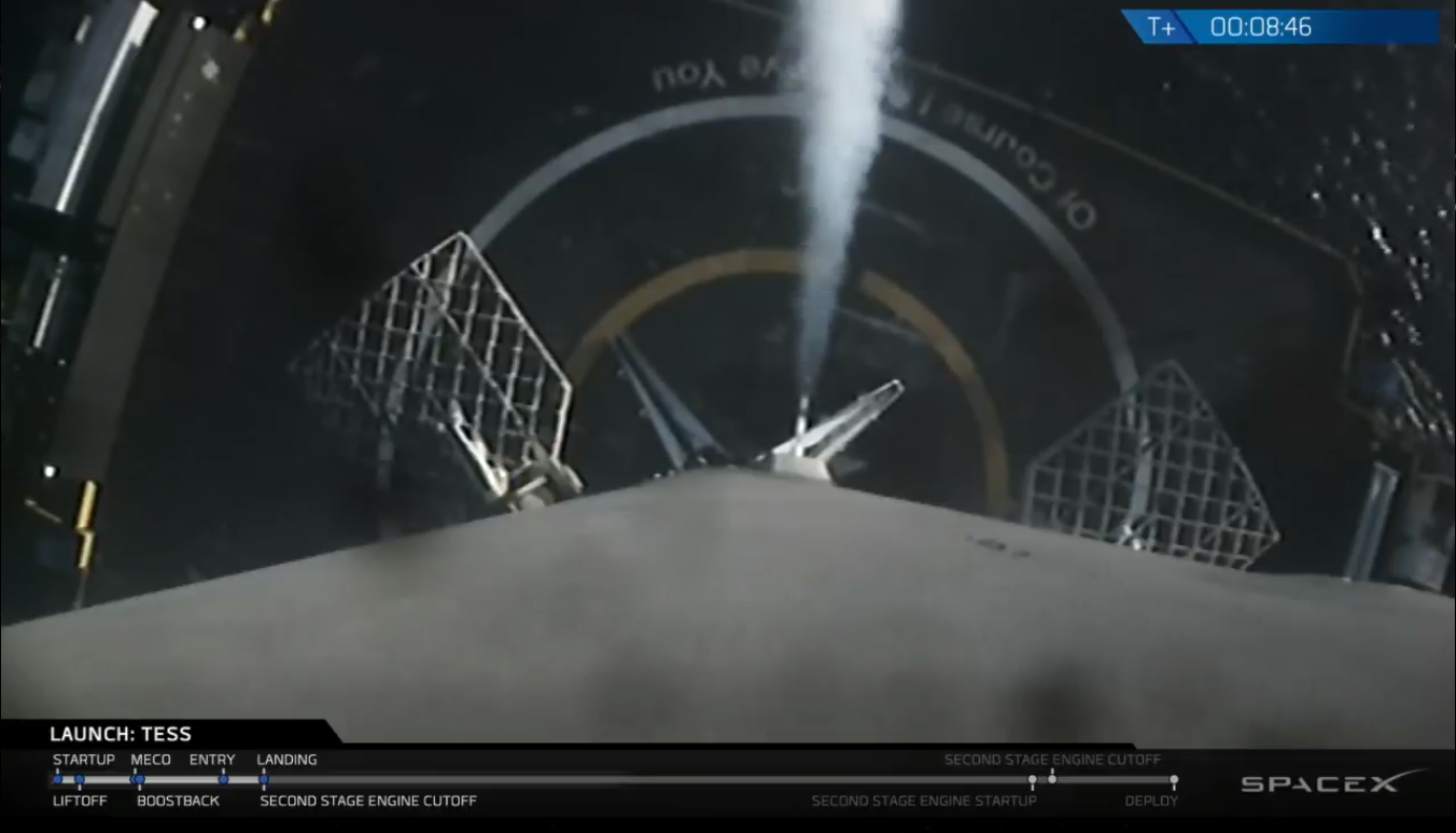 Do startu rakiety Falcon 9R z teleskopem TESS doszło w nocy z 18 na 19 kwietnia 2018 o godzinie 00:51 CEST z wyrzutni LC-40 na Florydzie. Start przebiegł prawidłowo i TESS został umieszczony na prawidłowej orbicie wstępnej o wysokości 200 x 270000 km i nachyleniu 28,5 stopnia.Start Falcina 9R z misją TESS / Credits – SpaceX
