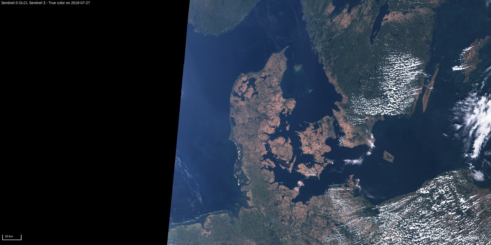 Widok na północną Polskę z dnia 26 lipca 2018 okiem satelity Sentinel 3 (kliknij by powiększyć) / Credits – Sinergise, ESA