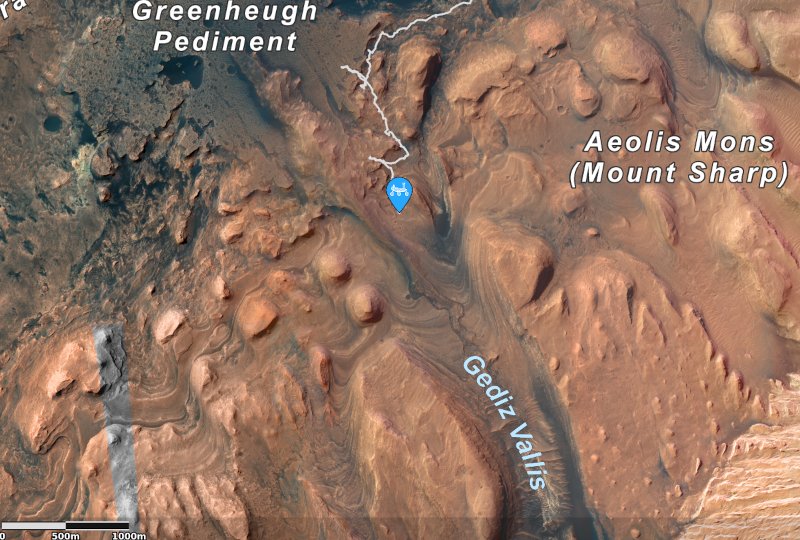 Przed łazikiem coraz ciekawsze obszary. Wyższe partie Gediz Vallis to naprzemienne ciemniejsze i jaśniejsze warstwy skalne, sugerujące przepływy większej ilości wody. Można zakładać, że przez najbliższe kilkanaście miesięcy łazik będzie podróżować w górę Gediz Vallis.