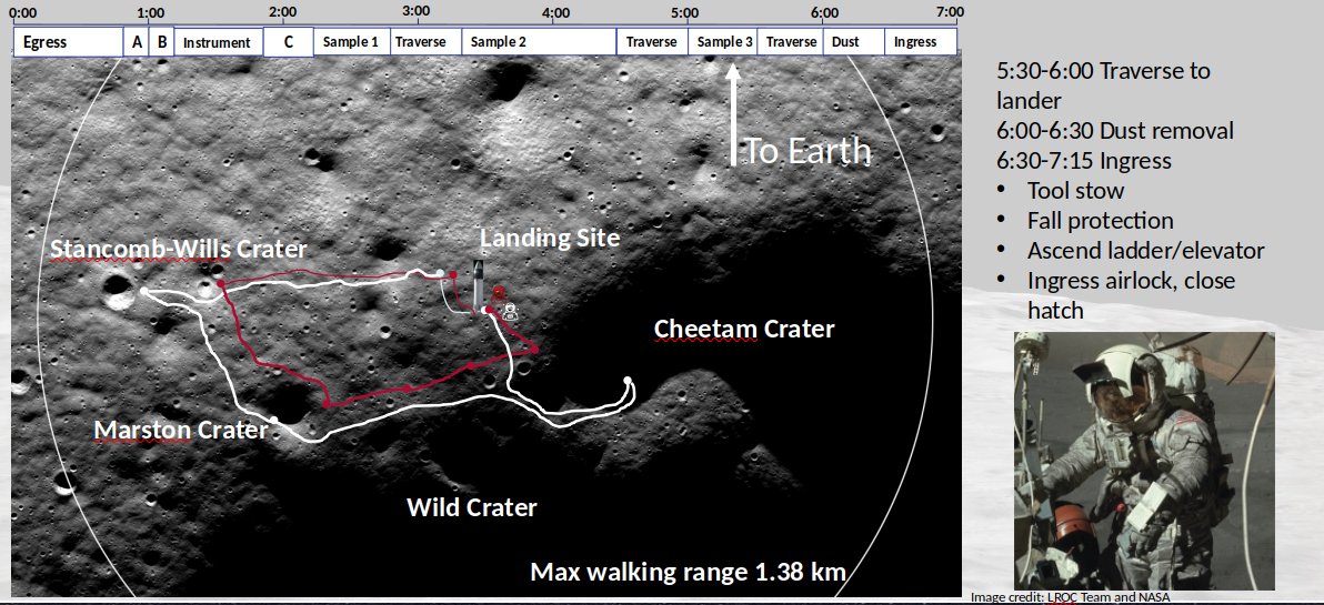 Spacer rozpocząłby się od zejścia na powierzchnię Księżyca, ustawienia narzędzi oraz wypowiedzi podobnej do “małego kroku” Neila Armstronga podczas misji Apollo 11. Następnie, w ciągu pierwszej godziny spaceru astronauci zebraliby kilka próbek skał i regolitu na wypadek szybkiego zakończenia prac. Wykonana zostałaby także inspekcja lądownika księżycowego. Chwilę potem doszłoby – w stylu misji z czasów programu Apollo – do połączenia z prezydentem USA.